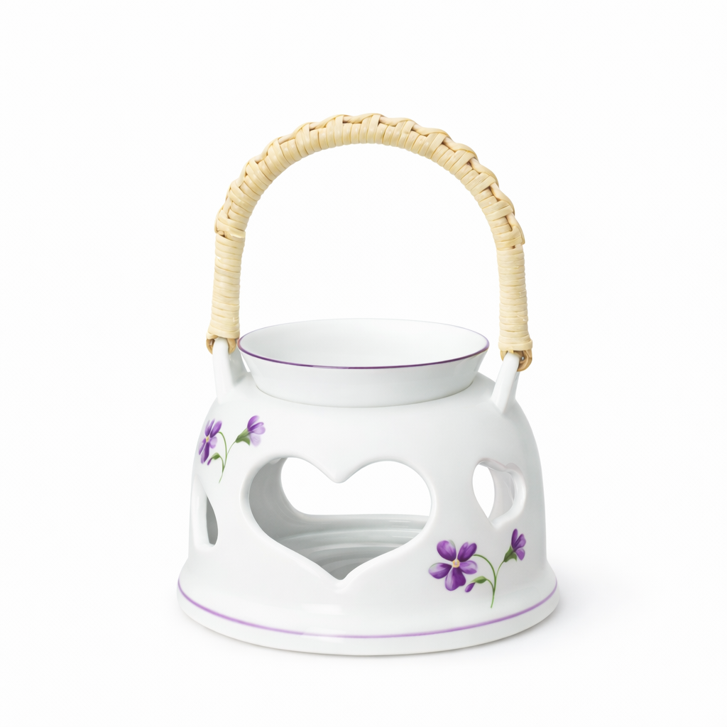 Porcelánová dvoudílná aromalampa fialová linka, dekor fialky - ratanové ucho