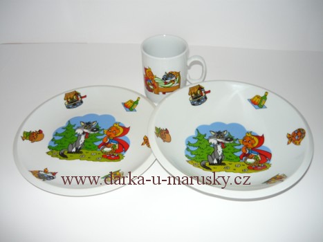 Dárková dětská jídelní souprava mělký a hluboký talíř pr. 205 mm a hrnček s dekorem Červená Karkulka. Tvary hrníčků se mohou měnit.