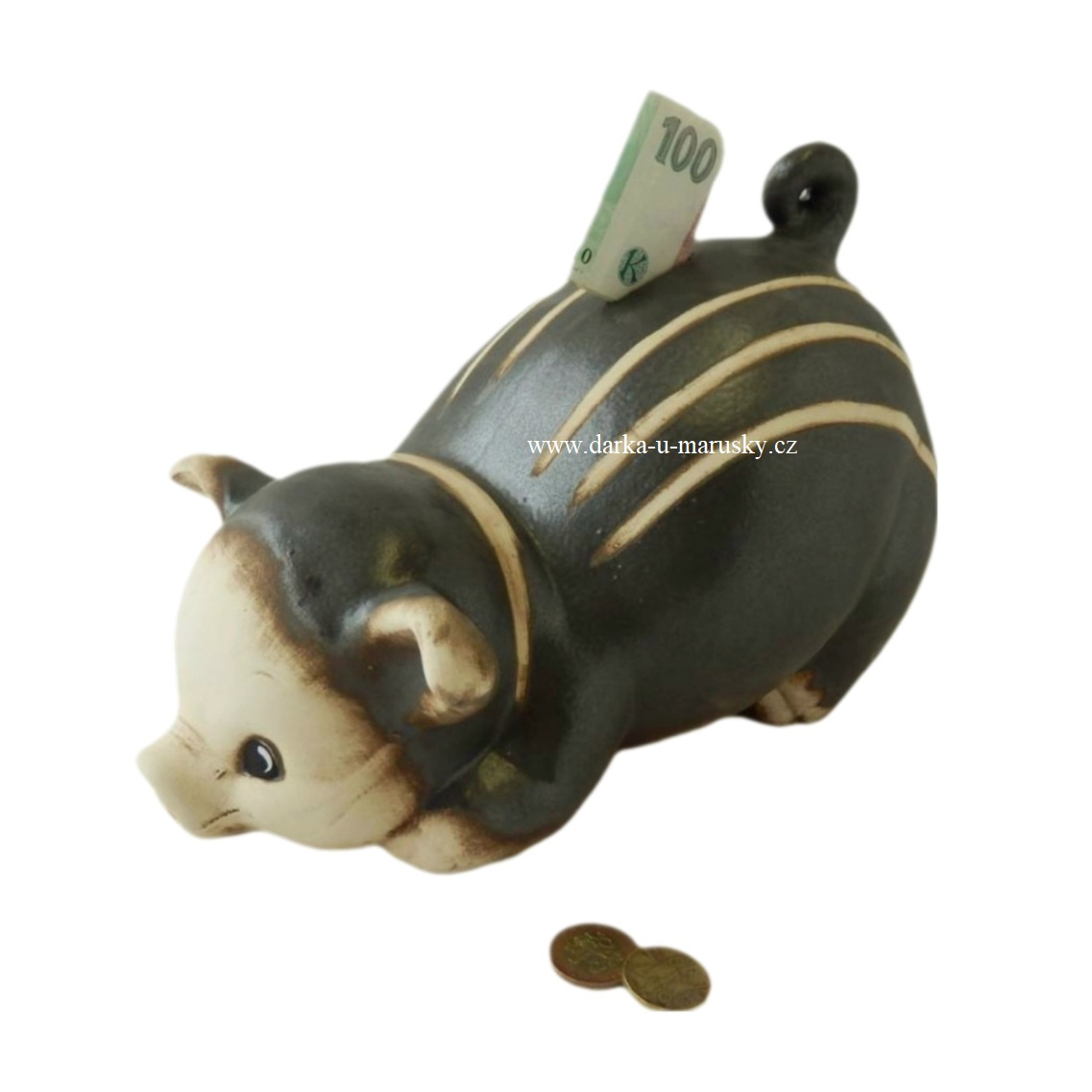 Keramická pokladnička ve tvaru prasátka.