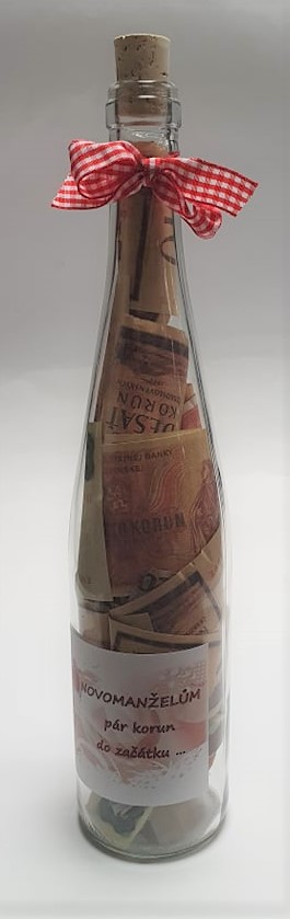 Text na láhvi: "NOVOMANŽELŮM pár korun do začátku ... "