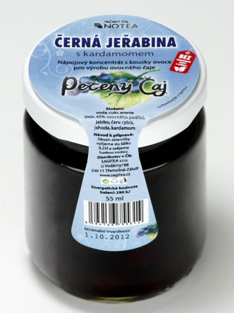 pečený ovocný čaj s příchutí černých jeřabin a kardamomu, rozměr: cca 4,5 x 6 cm, spotřeba cca 1rok ,složení: voda, cukr, aronie (min. 45% ovocného podílu), jablko, červ. rybíz, jahoda, kardamom