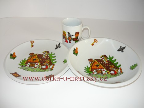 Dárková dětská jídelní souprava mělký a hluboký talíř pr. 205 mm a hrníček s dekorem Perníková chaloupka.