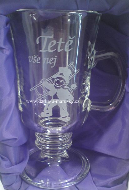 Pískovaná sklenička - Venézie dekor Tetě vše nej ,,Kominík"- na stopce s uchem