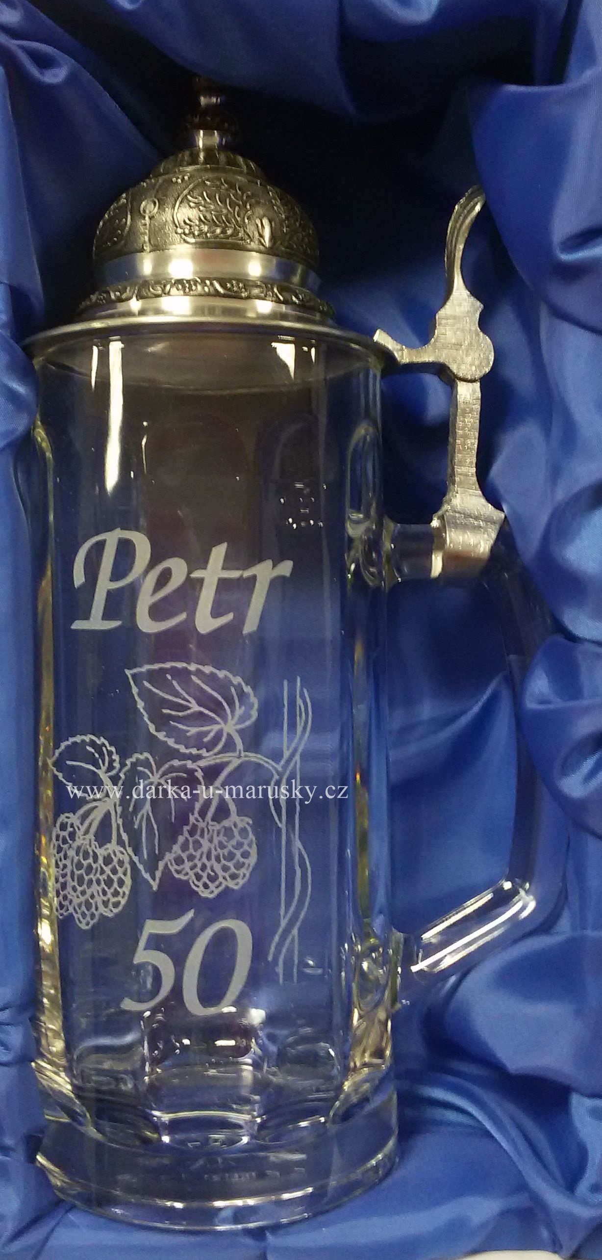 Pískovaný pivní korbel s cínovým víkem - Chmel č.1