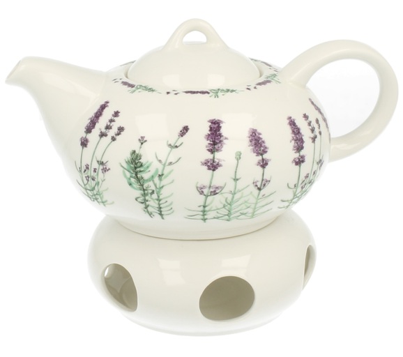 Porcelánová konvička s ohříváčkem na čajovou svíčku s dekorem levandule,