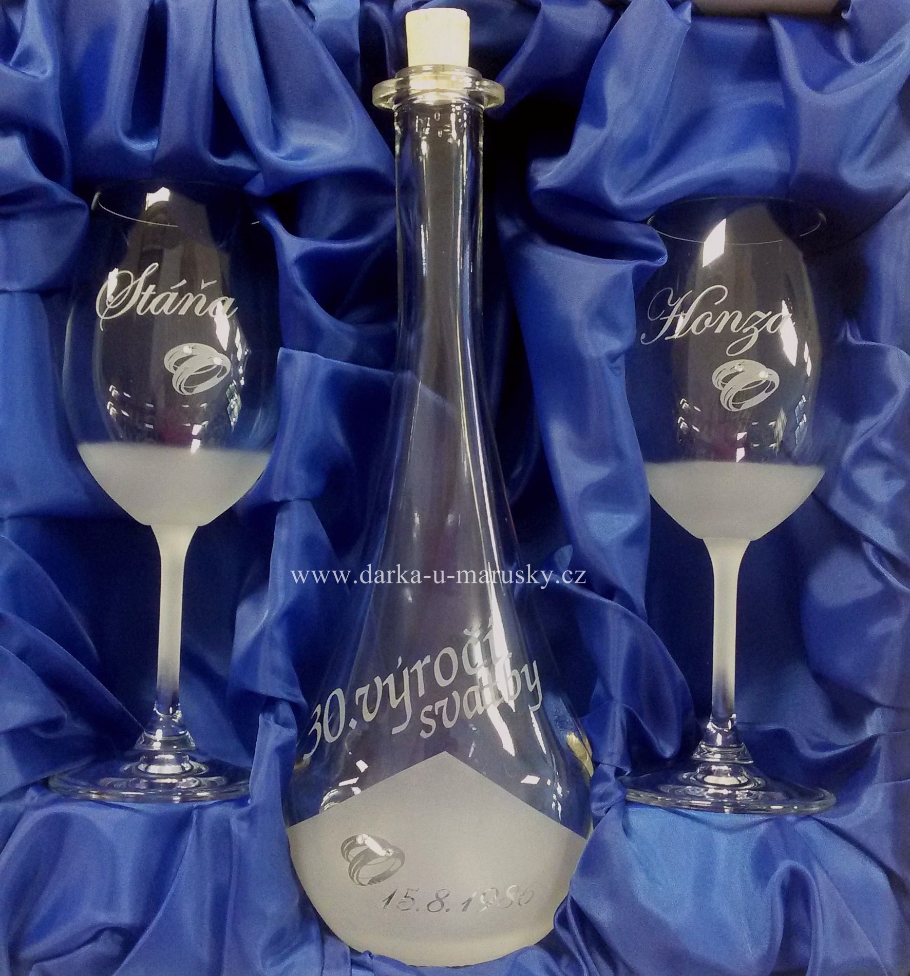 Cena je za celou soupravu (2 vinné skleničky + 1 láhev s dárkovou krabičkou, u které máte možnost si vybrat barvu látky).