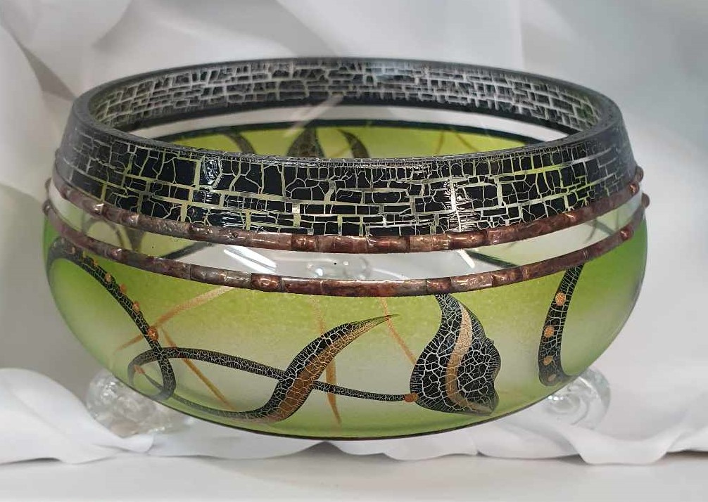 Miska na 3 nožičkách - ručně foukaná miska, dekorováná zelenými barvami a květemSkladem1 299 Kč/ ks1 074 Kč bez DPH