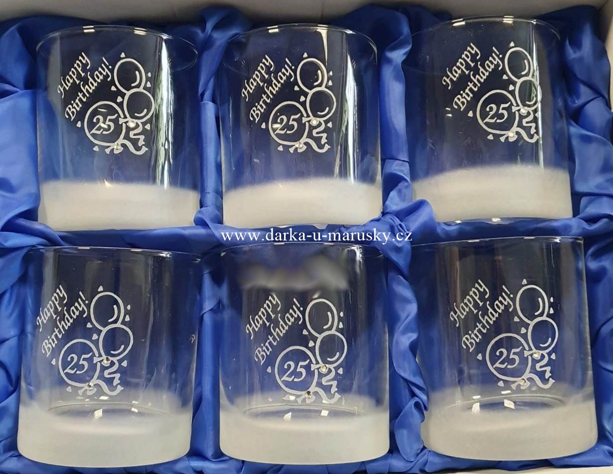 Elegantní pískované skleničky na whisky / souprava 6ks - dekor balónky s textem Happy Birthday