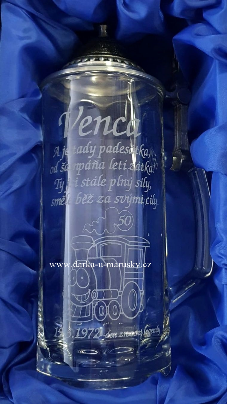 - Pískovaný korbel s cínovým víkem - Mašinka