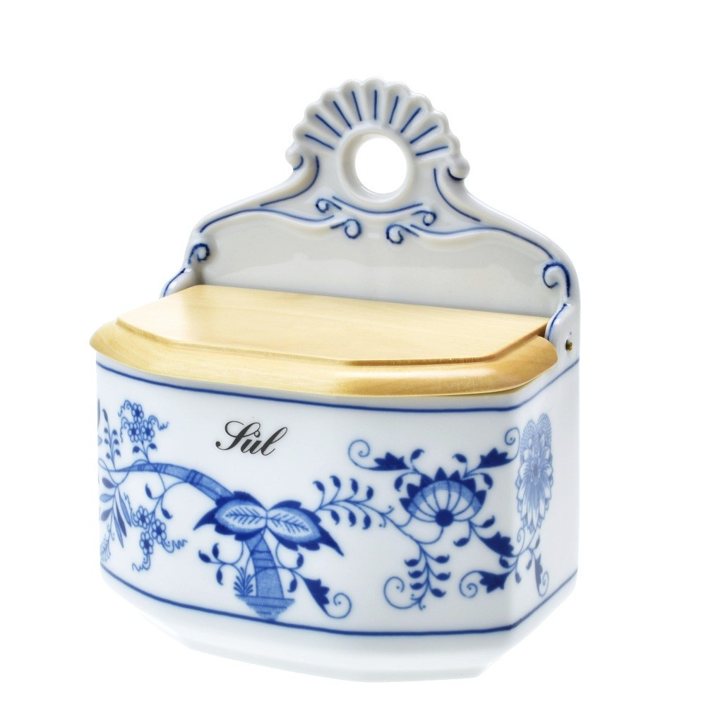 Závěsná porcelánová dóza s dřevěným víčkem "Sůl" originál cibulák